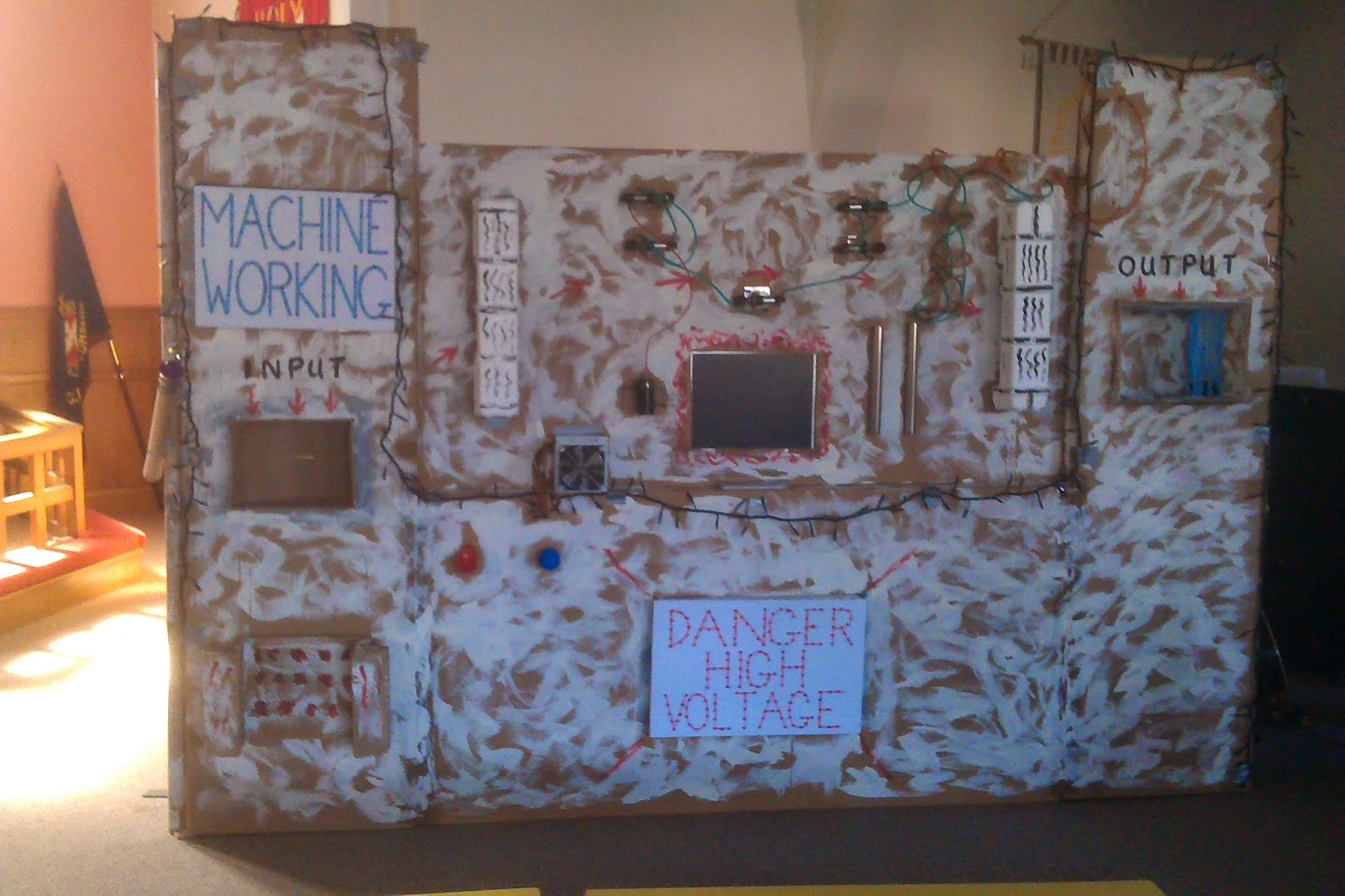 The church had been prepared and decorated in preparation for the children to arrive. The largest item of "furniture" was the wonderful Mega Machine. The Mega Machine is a very special creation which was designed to make things bigger. The children found it very convincing, and loved it even when it went wrong and began squirting water at everyone!